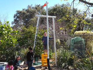 Louie had a plan, he drew a new kind of dinosaur - a charge dinosaur and then he wanted to interpret it in the sandpit. Much discussion resulted in a decision to use the plumbing pipes and work began. Once it was underway everyone chipped in to help.